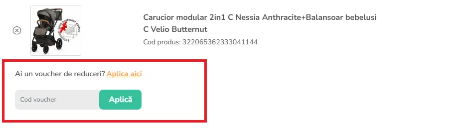 Codul de reducere se introduce in cosul de cumparaturi, intr-un camp special denumit “Ai un voucher de reduceri? Aplica aici”, situat sub lista produselor adaugate.